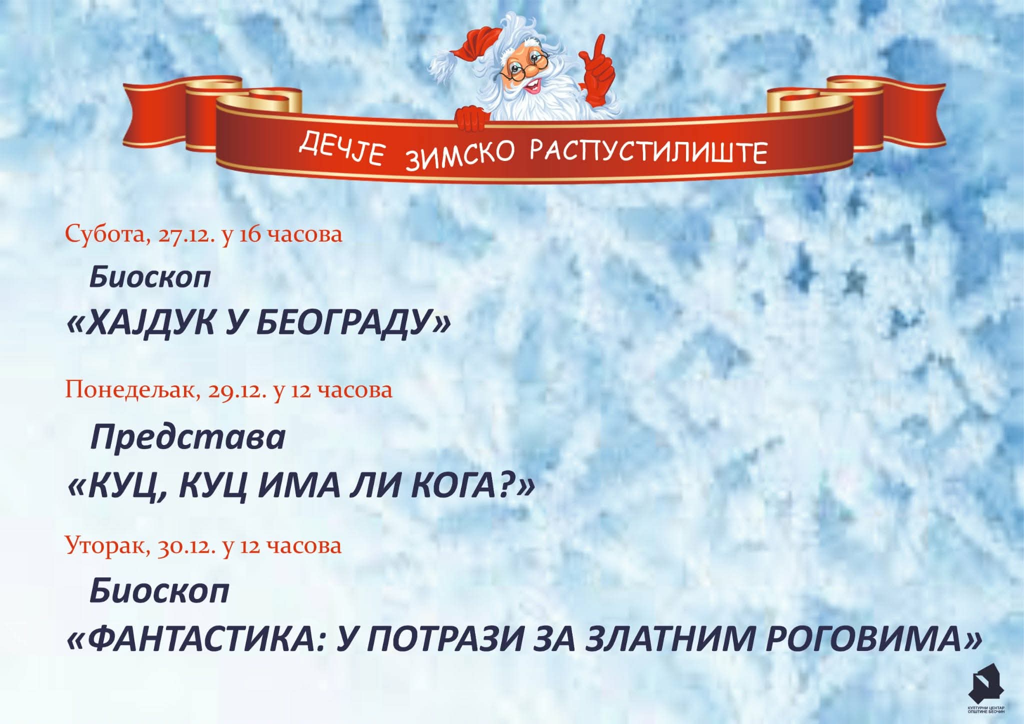 За крај године, традиционално смо припремили програм за наше најмлађе. Први део Зимског распустилишта одржаће се од суботе, 27. децембра, до уторка, 30. децембра, а на програму ће се наћи: Субота, 27.12. у 16.00 часова – „Хајдук у Београду“, домаћи филм Понедељак, 29.12. у 12.00 часова – Представа: „Куц, куц има ли кога?“ Уторак, 30.12. […]